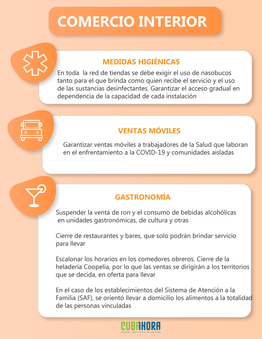 Por otro lado, el gobernador de La Habana señaló que desde este sábado permanecen cerradas las playas, piscinas y grandes parques recreativos, pues las condiciones actuales no permiten disfrutar de estas instalaciones. En el orden del Comercio Interior se ordenó el cierre total de bares, cafeterías y restaurantes, que solo podrán ofertar productos para llevar.