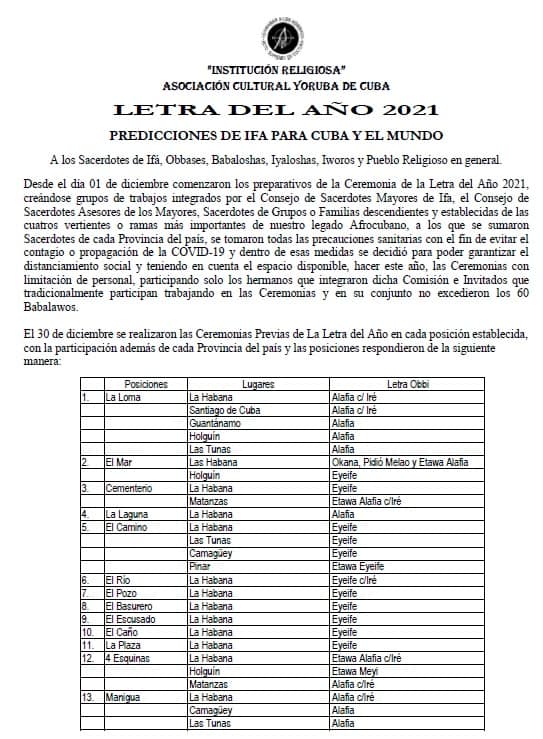 Un grupo de sacerdotes cubanos de la religión Yoruba dio a conocer en la madrugada de este primero de enero la Letra del Año, algunos consejos para enfrentar el nuevo período que comienza. La ceremonia, donde se reúnen practicantes consagrados de gran experiencia consagrados al culto de Ifá es una de las tradiciones más arraigadas para los creyentes.