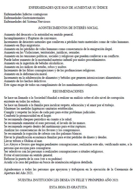 La principal profecía de la Letra del Año en este 2021 es "Un bien de salud firme y seguro en la tierra que va a proporcionar Orula". Asimismo, la bandera de este año es azul con ribetes en amarillo.