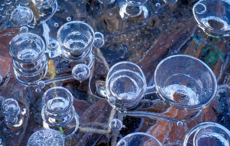 BURBUJAS DE GAS METANO CONGELADASS BAJO LA SUPERFICIE DEL AGUA