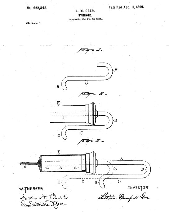 La aportación de Letitia Geer al mundo de la ciencia médica fue, sin duda, de un gran valor. Si bien es cierto que antes ya se usaban otras jeringuillas de tipo más rudimentario, la innovación de su nuevo modelo fue, principalmente, que se podía usar con una sola mano, algo que facilitaba mucho el trabajo de un médico. La cuestión de cómo inyectar sustancias en el cuerpo humano -medicamentos o anestesias– y de cómo sustraerlas para analizarlas, quedó solventada a partir de 1899 gracias a la jeringa de esta inventora.