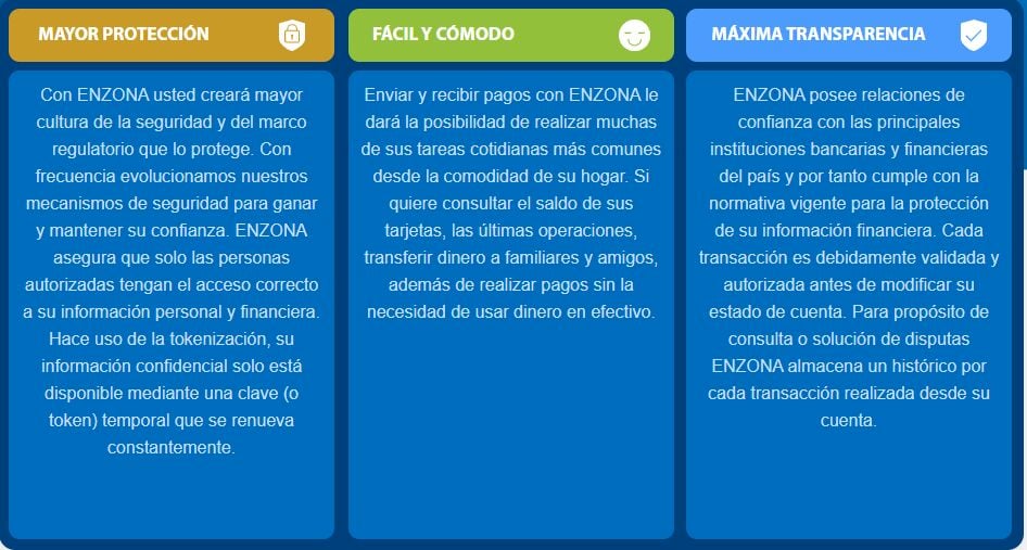Por su parte, Enzona, además de la aplicación móvil para sistema operativo Androide, tiene una interfaz web donde los usuarios pueden registrarse con sus tarjetas magnéticas de cualquier entidad bancaria, correo electrónico o número de teléfono móvil y datos personales. Con esta pasarela podrá hacer trasferencias, donaciones, consultas de operaciones, compras de regalos y pago del servicio eléctrico con descuento de un 6 % del monto total.