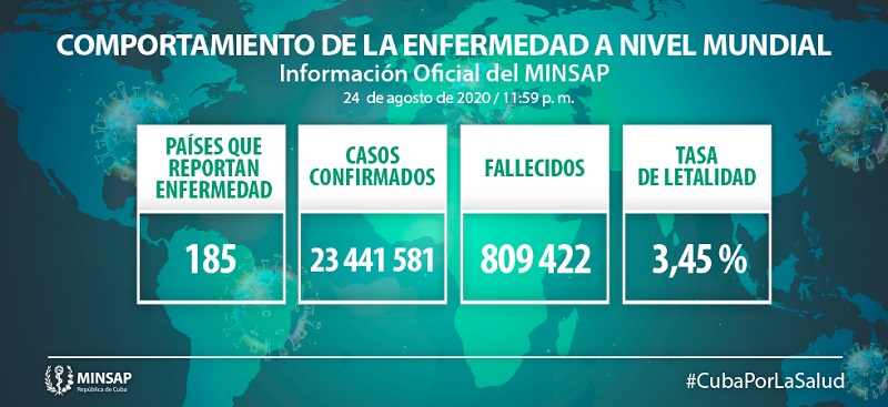 Hasta el 24 de agosto se reportan 185 países con casos de COVID-19, asciende a 23 millones 441 mil 581 los casos confirmados (+ 197 mil 960) y 809 mil 422 fallecidos (+ 3 mil 682) para una letalidad de 3,45% (-0,01).
