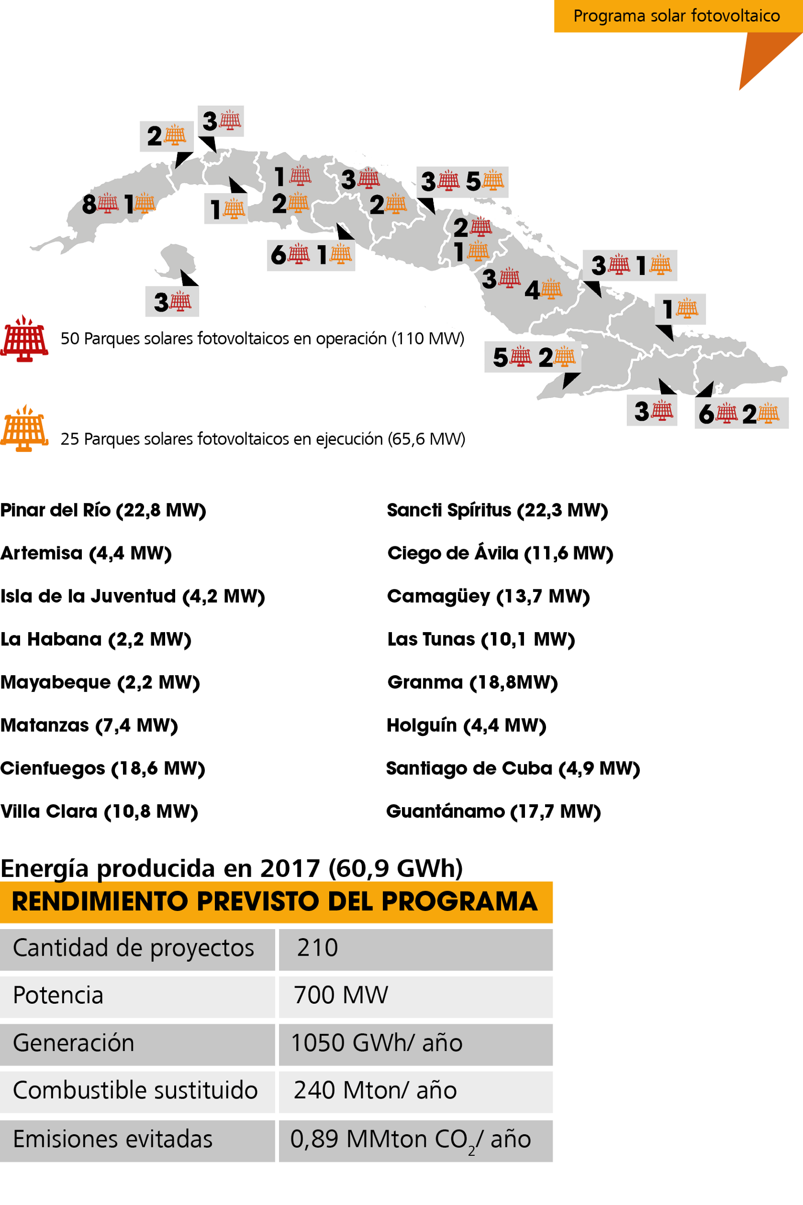En la práctica, se encuentran instalados y en operación 50 parques solares fotovoltaicos, para una potencia de 116 MW, distribuidos en 12 provincias y la Isla de la Juventud.