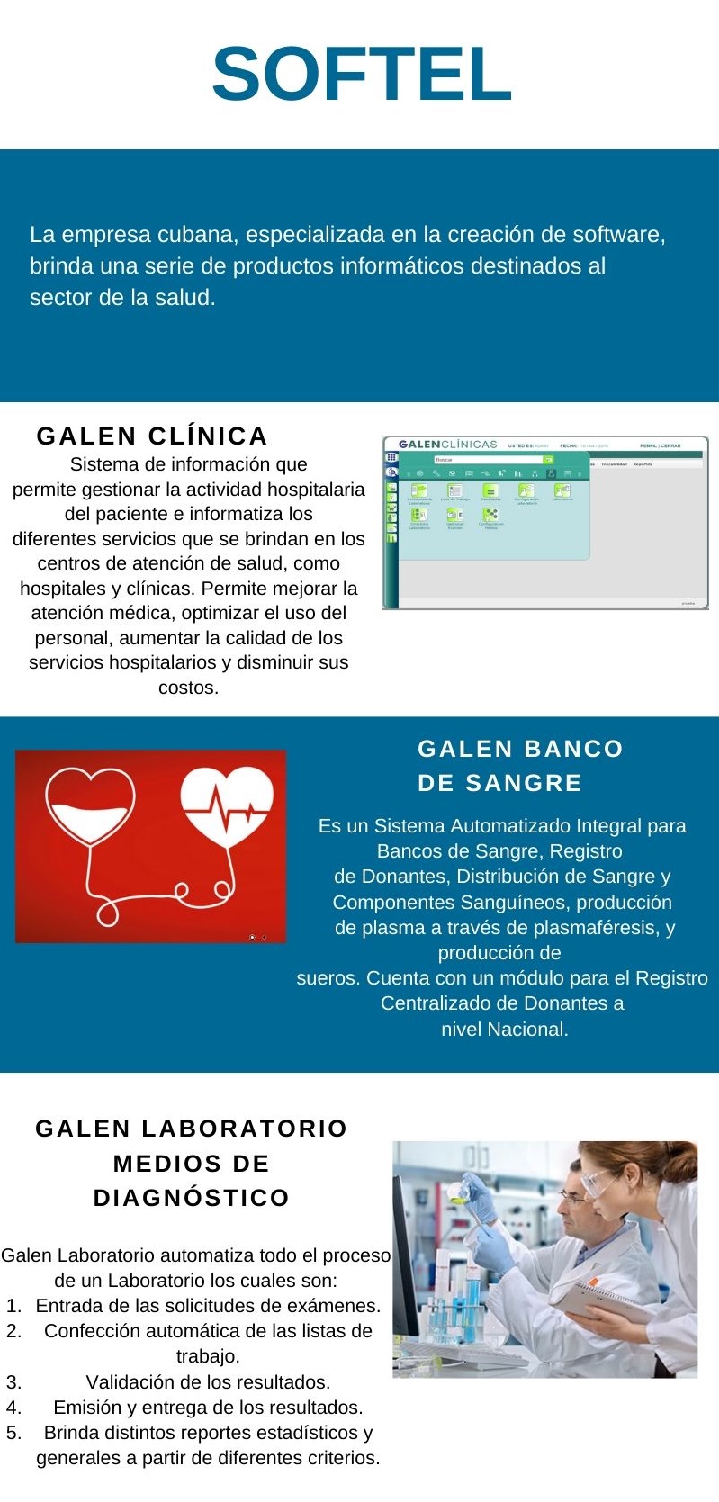 Se trata de un proceso de aplicaciones y servicios informáticos que desarrolla la empresa cubana productora de software SOFTEL, en función de informatizar sectores como el turismo, la salud y la gestión empresarial.
