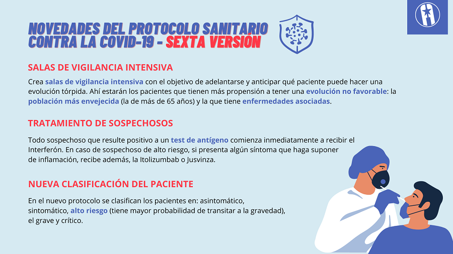 Recientemente fue dado a conocer la sexta versión de ese protocolo, el cual se ajusta a la situación epidemiológica y mejora la gestión de los casos sospechosos y confirmados. Este solo será transitorio, puesto que ya se prepara un séptimo a partir de un grupo de ensayos clínicos, expresó la doctora Ileana Morales Suárez, directora nacional de Ciencia e Innovación Tecnológica del Ministerio de Salud Pública (MINSAP) en el programa Mesa Redonda.