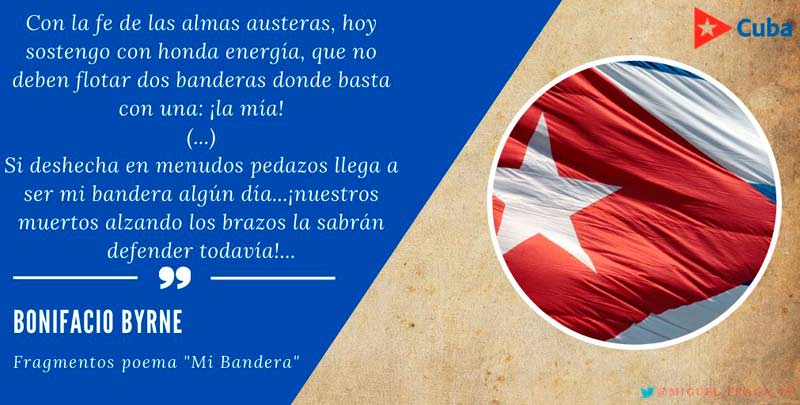 Nuestra bandera de la estrella solitaria, porta, en su dobleces, las vibraciones estético-ideológicas que marcaron la búsqueda de nuestra identidad, la pasión de un pueblo nuevo decidido a brillar en el firmamento. La dibujó un poeta inspirado en las metáforas de otro. Los que le han cantado en los momentos más tensos de su flotar y su enterrarse en la altura y en la hondura del ser cubano, han expresado el eco y el ritmo de ese devenir. Así lo hizo Bonifacio Byrne, al que el pueblo calificó como “Poeta de la bandera”.