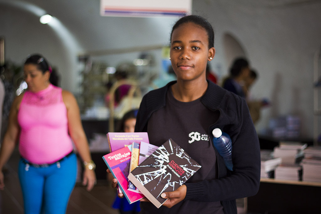 “Eso mismo estaba pensando, que no sé dónde voy a guardar tantos libros, ya esta es la segunda vez que vengo a la Feria este año y en la casa tenemos un gran librero con muchos libros de mi mamá sobre medicina y otro mío con muchos ejemplares para mi carrera, pero ya no cabe un ejemplar más. Soy periodista. Me compré ahora un libro de Alejo Carpentier de entrevistas, crónica y ensayos y otros de cine cubano para un trabajo que estoy realizando. Siempre he leído, mayormente escogí la carrera porque me gustaba mucho leer y durante los estudios ese bichito se va desarrollando más. En dependencia de cómo es uno, de cómo lo de educaron, uno sabe que le gusta. El librero mío por eso tiene de enfermería y de Periodismo y déjame decirte que yo he leído mucho sobre salud”.
