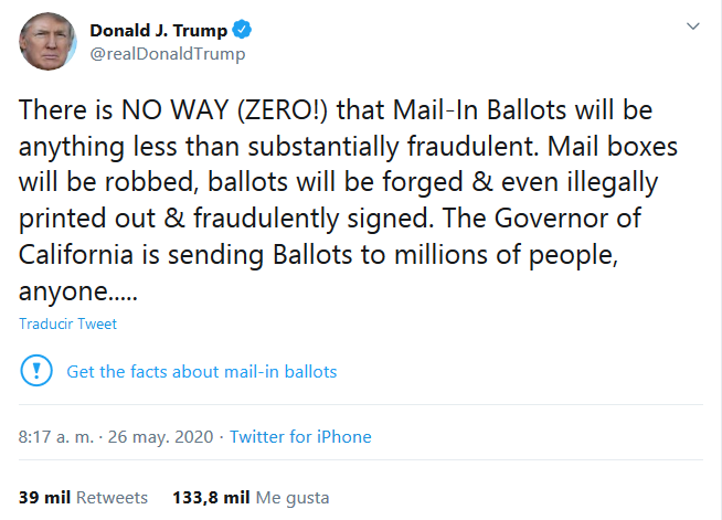 Dicha orden llega tras la censura por parte de Twitter de criterios violentos publicados por el mandatario y después de que se le colgara una etiqueta de verificación por engañoso a un tuit que acusaba de fraude la decisión del gobernador demócrata por el Estado de California, Gavin Newsom, de enviar papeletas de voto por correo a todos los electores registrados en calidad de alternativa ante la crisis sanitaria causada por el nuevo coronavirus.
