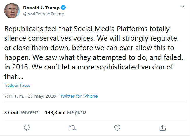 En un contexto matizado en los últimos días por los ataques de Trump a la exsecretaria de Estado y ex candidata presidencial demócrata, Hillary Clinton, y por las amenazas de mandar a la cárcel al exdirector del Buró Federal de Investigaciones, James Comey, el Ejecutivo ha asumido la acción de Twitter con un marcado sesgo político. “Las plataformas de las redes sociales silencian totalmente las voces conservadoras. Regularemos con contundencia, o cerraremos, antes de permitir que esto suceda”, expresó el dignatario.