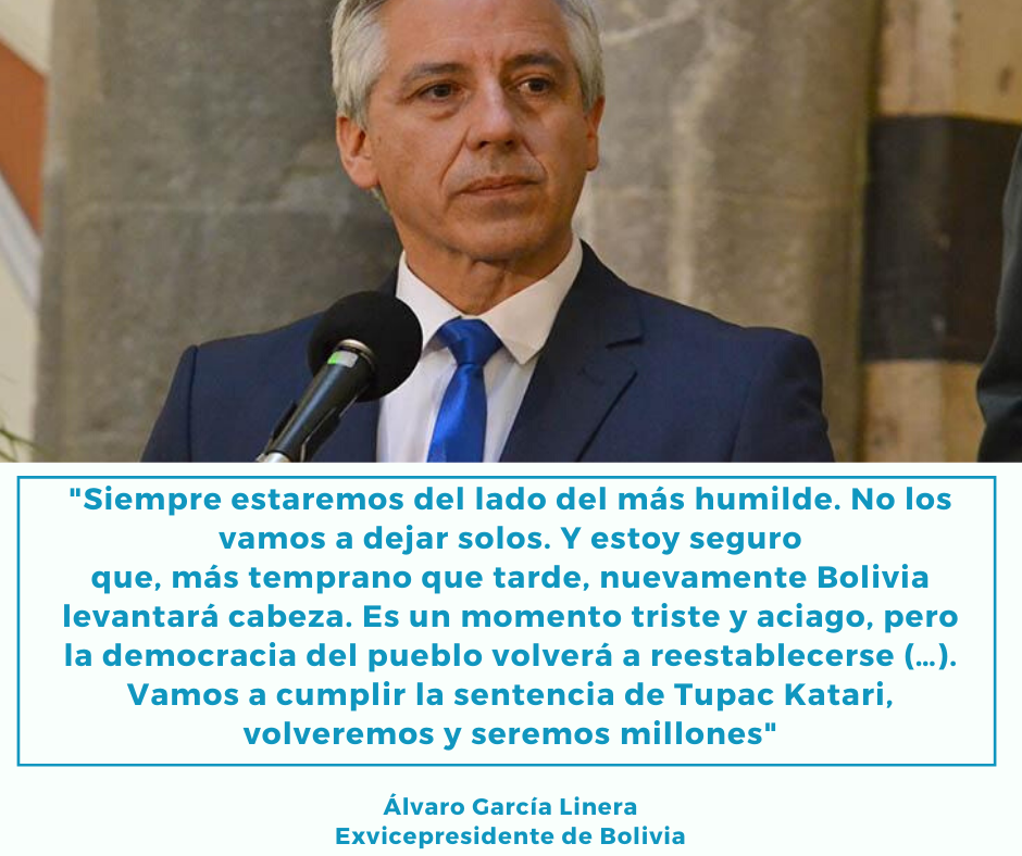 Tanto Morales como Linera explicaron al pueblo boliviano que tomaron la decisión de dejar sus responsabilidades luego de 13 años, nueve meses y 19 días de trabajo conjunto, debido a la violencia desatada contra la población indígena y trabajadora más humilde, los miembros del oficialista Movimiento al Socialismo (Mas) y seguidores de los dirigentes gubernamentales.