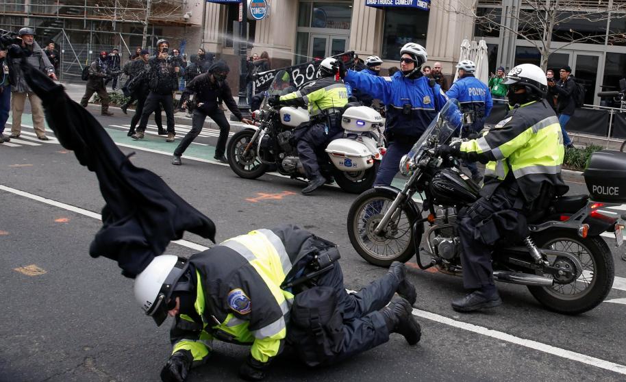 Ante tal represión era presumible que hubiera violencia y así fue, mientras llegaba la hora señalada, 12 del mediodía, cuando Trump dijo su discurso. Los manifestantes portaban pancartas con frases como “make racist afraid again”, o “no borders”, que fueron impedidos de llegar a la zona del capitolio.
