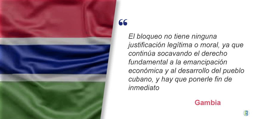 Gambia también se unió al reclamo por el cese del bloqueo y demás leyes, medidas o políticas que impidan el desarrollo libre del comercio y la navegación internacionales, ya que manifestó que son contrarias a los propósitos y principios de la Carta y al derecho internacional.