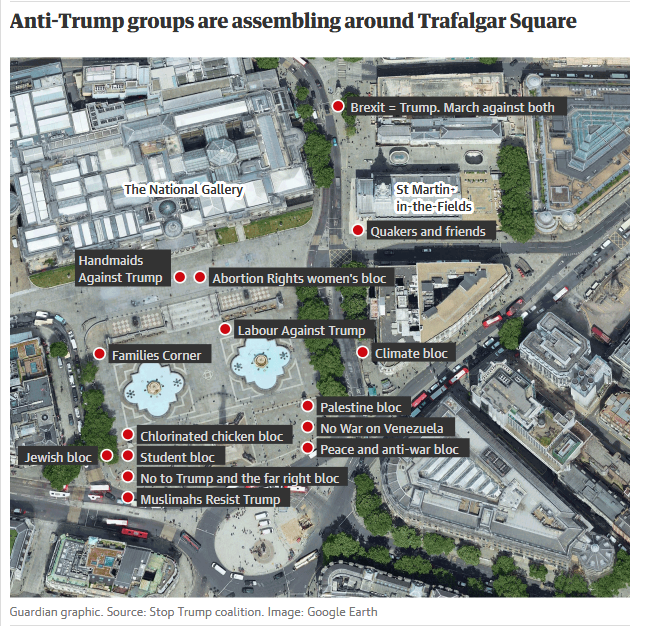 Los organizadores de la protesta de "Juntos Contra Trump" han anunciado el día como un "carnaval de resistencia", con los manifestantes reuniéndose en la Plaza de Trafalgar desde las 11 a.m. (hora local) para declarar una "zona libre de Trump".