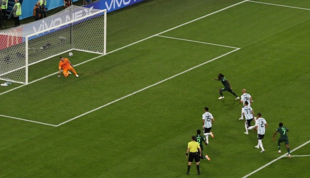 Sin embargo, la primera diana albiceleste llegó en el minuto 14 con un largo balonazo enviado por Banega desde el centro de la cancha; Messi lo bajó con su educada pierna zurda y le pegó cruzado de derecha, indetenible para el joven arquero Francis Uzoho.