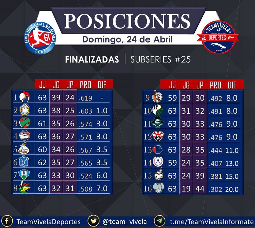 Los otros conjuntos que pasaron la escoba fueron Mayabeque y La Isla. Los primeros consiguieron sacudirse de un mal momento que los llevó a firmar solo tres éxitos en sus últimas diez salidas al terreno, y los Piratas volvieron a pegarse a la raya que parte en dos mitades iguales al grupo.
