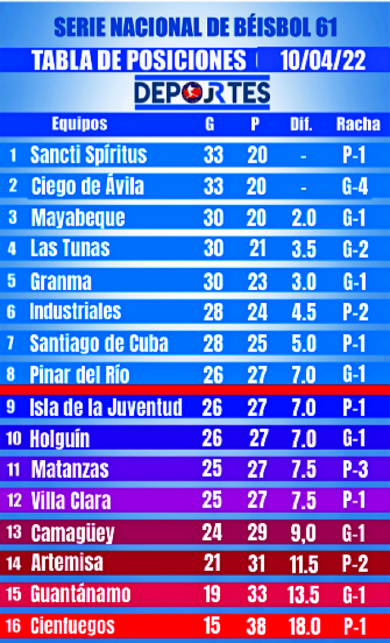 Que cuatro equipos compartan el octavo lugar, entre ellos, Matanzas, Pinar del Río, y la guerrilla de La Isla, y que haya otros elencos pegados lo mismo por encima que por debajo, garantiza, al menos, un final emocionante, pero le repito: no sea muy exigente con la calidad. O tendrá que seguir los juegos cerca de los frascos de medicamentos para la presión y el corazón.