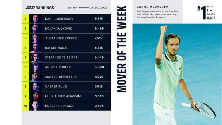 La inesperada derrota del serbio Novak Djokovic en la fase de cuartos de final del certamen celebrado en Dubái ante el checo Jirí Vaselý y el avance del ruso Daniil Medvedev hasta las semifinales en tierras aztecas trajo como consecuencia la permuta en la cima del listado universal.