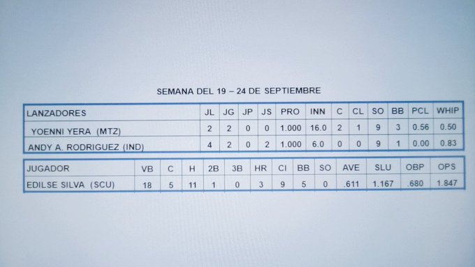 Y hasta mañana lunes a las 12 del mediodía se mantiene la votación popular por el Jugador de la semana del 19 al 24 de septiembre, en el sitio web oficial del beisbol cubano (www.beisbolcubano.cu).