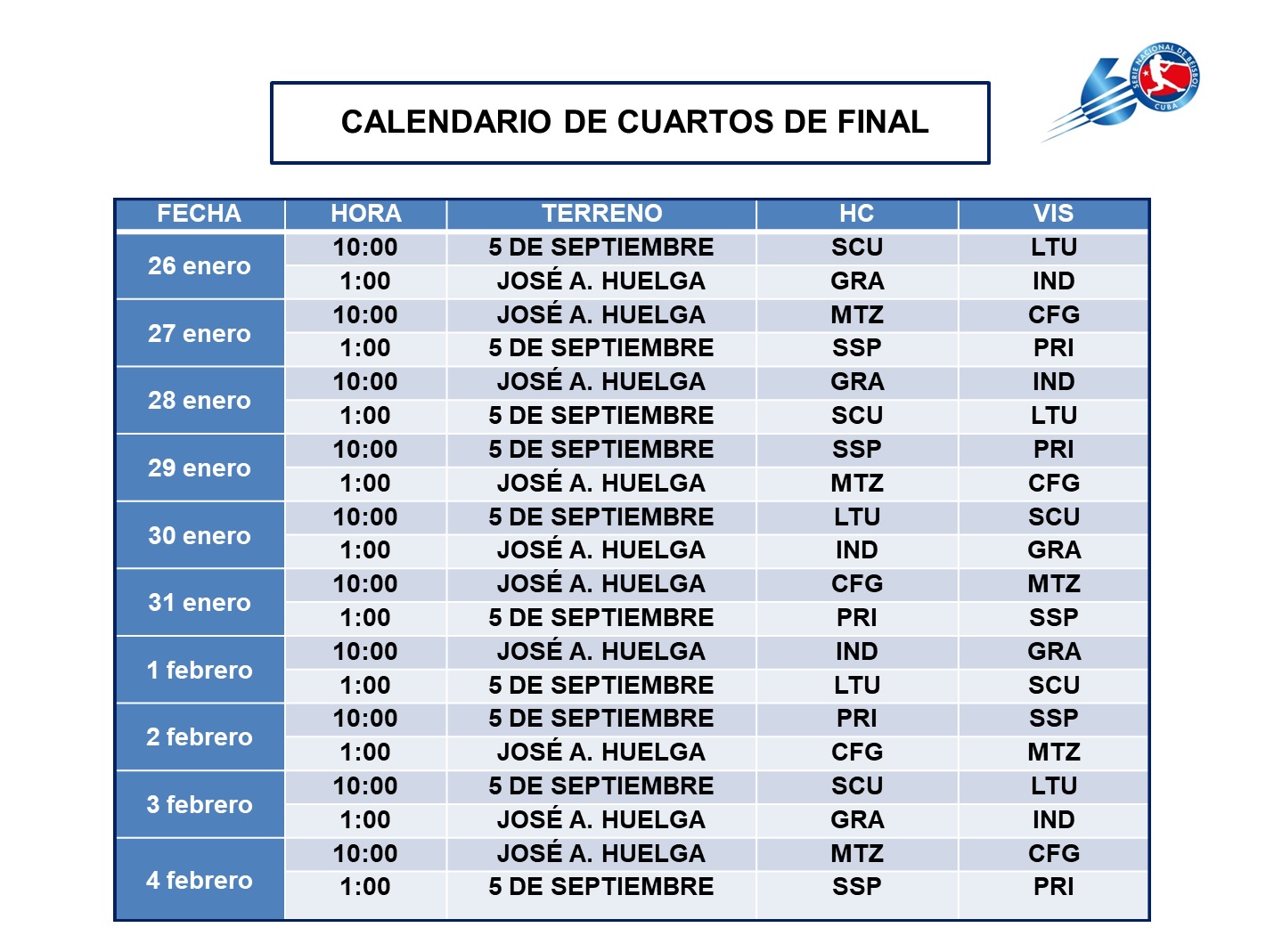 Adjuntamos el calendario completo de los cuartos de final. Ningún juego terminará por lluvia u oscuridad, aunque sea válidos por regla; al día siguiente hay que concluirlos. Tampoco regirá la Regla Ibaf para decidir los choques más allá del noveno inning.