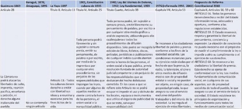 Es significativo que desde 1869 hasta 1976 la mayoría de las Constituciones cubanas incluyeron la libertad de prensa como parte de los derechos individuales de los cubanos.