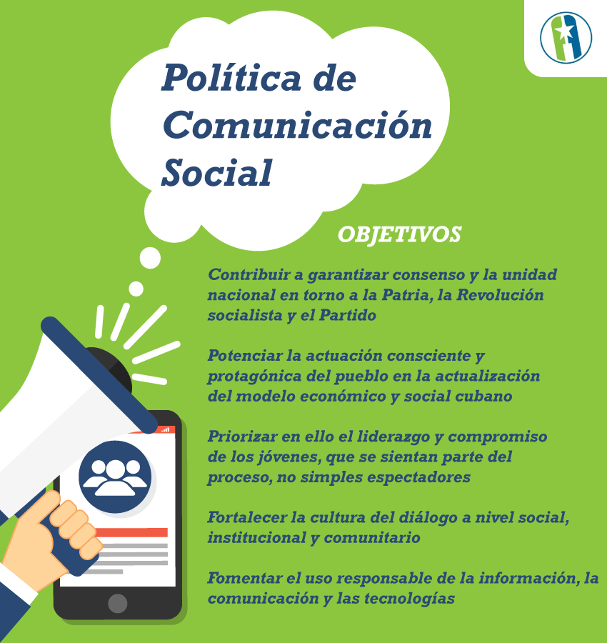 Cuba cuenta con una Política de Comunicación del Estado y del Gobierno cubanos que fue aprobada en enero de 2018, luego de ser evaluada y aprobada también por la dirección del partido. Esta política abarca la sociedad en su conjunto y debe ser cumplida por los órganos, organismos del estado, el gobierno, otras formas de propiedad no estatales, los medios de comunicación masiva, las organizaciones políticas y de masas, asociaciones, fundaciones, todos los ciudadanos que residen de manera permanente o temporal en Cuba o que transiten por el territorio nacional.