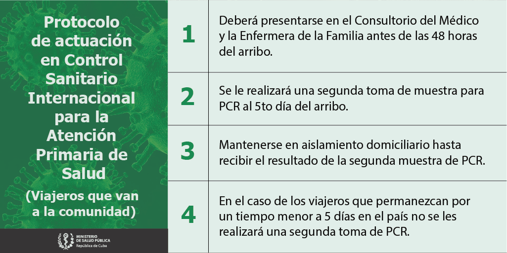 R/: Todo viajero internacional que arribe al país se le realizará un primer PCR a su llegada a alguno de los Puntos de Entrada, y, el que va hacia la comunidad deberá permanecer en aislamiento estricto en la vivienda hasta que llegue el resultado negativo del segundo PCR realizado al 5to día del arribo por su área de salud.