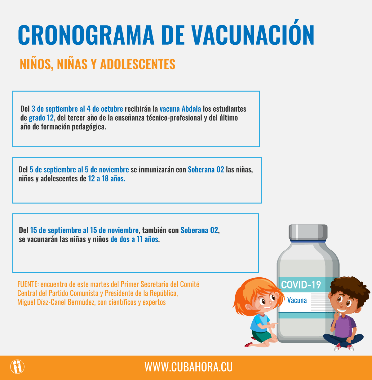 Para ello, la población infantil se ha dividido en tres grupos: el primero compuesto por los estudiantes de 12 grado, los de tercer año de la Enseñanza Técnico Profesional (ETP) y del último año de Formación Pedagógica; el segundo grupo incluirá a los niños y niñas de 12 a 18 años y también a los de 6to grado; en el último grupo se vacunarán los infantes que cursan desde Preescolar hasta 5to grado.