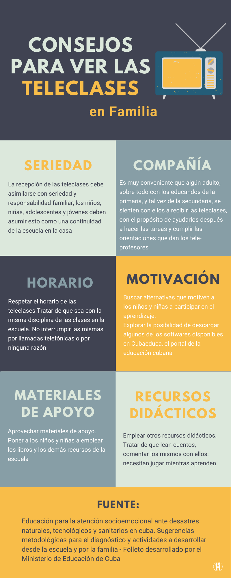 En nuestro caso, fue y es la televisión el principal soporte. Teleclases para niños y adolescentes en edad escolar se transmiten como sustituto a las presenciales. Estas se desarrollan con el objetivo de repasar contenido y orientar el autoestudio con apoyo de la familia, para cuando las condiciones sean óptimas regresar a las escuelas.
