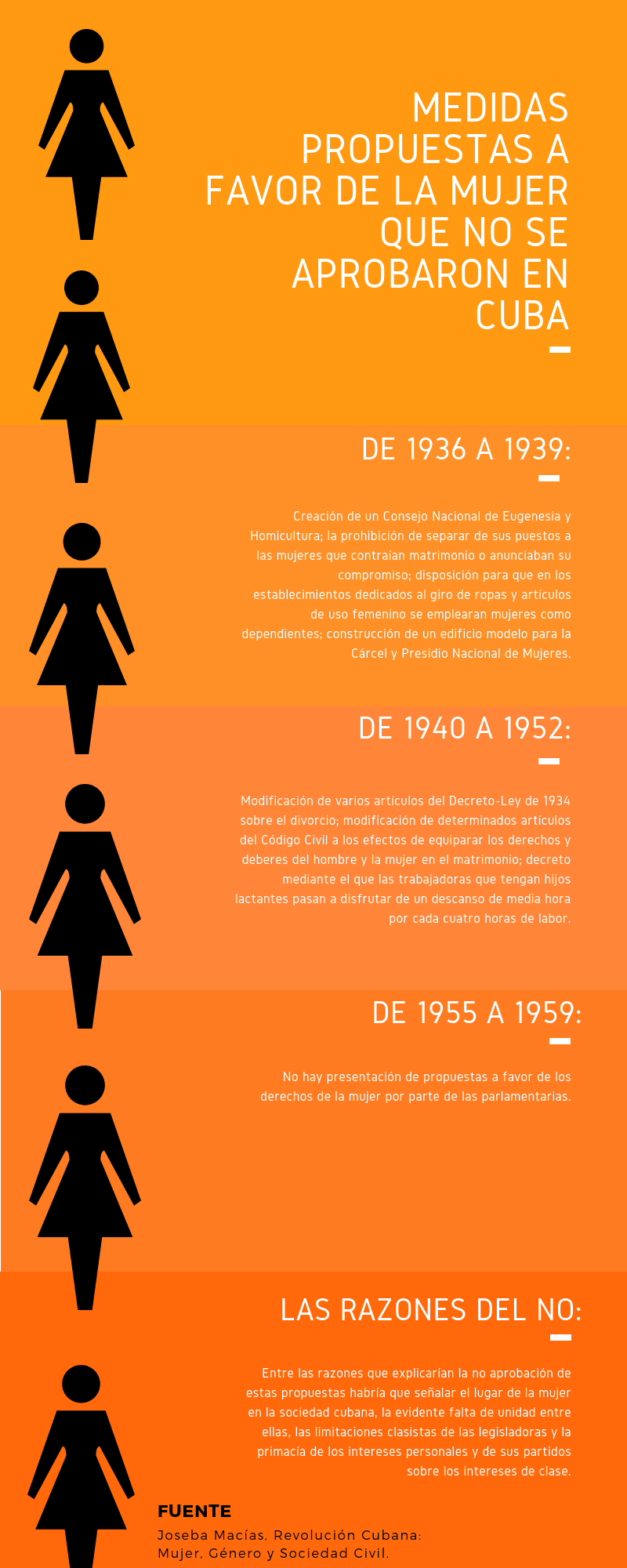 “La doctora Elvira Díaz Vallina en su ponencia La visibilidad y la invisibilidad de la mujer en la historia de Cuba (...) expuso que el equipo de profesoras universitarias dirigido por ella ha estudiado los expedientes de 675 mujeres combatientes y en ninguno aparecen vestigios de un pensamiento femenino dirigido a exigir mejoras a sus derechos femeninos. Díaz Vallina afirmó: “Ninguna de las organizaciones insurreccionales presentó reivindicaciones para la mujer en sus programas de lucha”. Tampoco lo hicieron las agrupaciones femeninas. Una explicación de este hecho particular lo ofrece Maruja Iglesias, dirigente del Frente Cívico de Mujeres Martianas: “(...) Nosotras no luchábamos por los derechos de la mujer. Nosotras luchábamos por lo que era de beneficio para todo” (Caner Román, 2004).