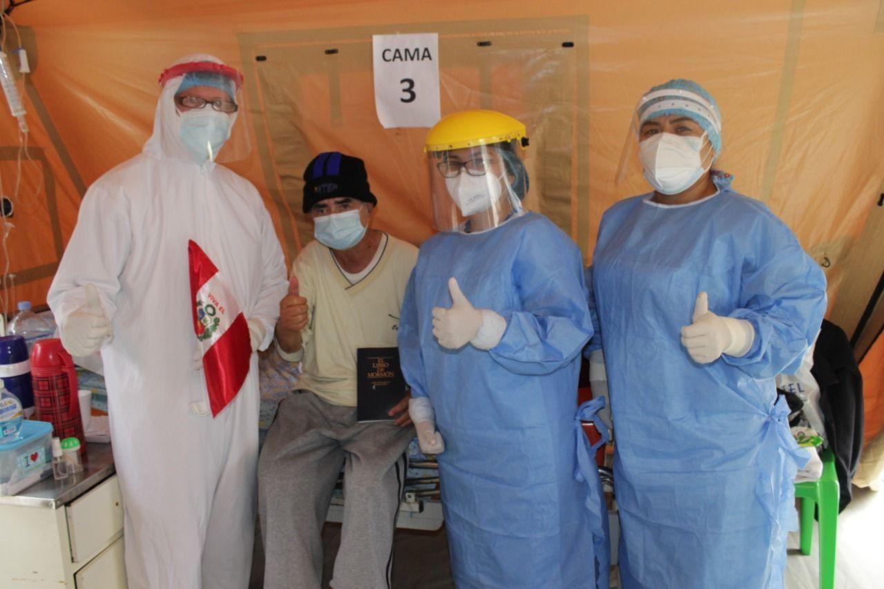 Don Manuel Valverde, el paciente de la cama 3, minutos antes de recibir el alta médica, quien regalara a la brigada de médicos cubanos una bandera peruana como agradecimiento (Foto: Cortesía de la brigada médica cubana en Perú)