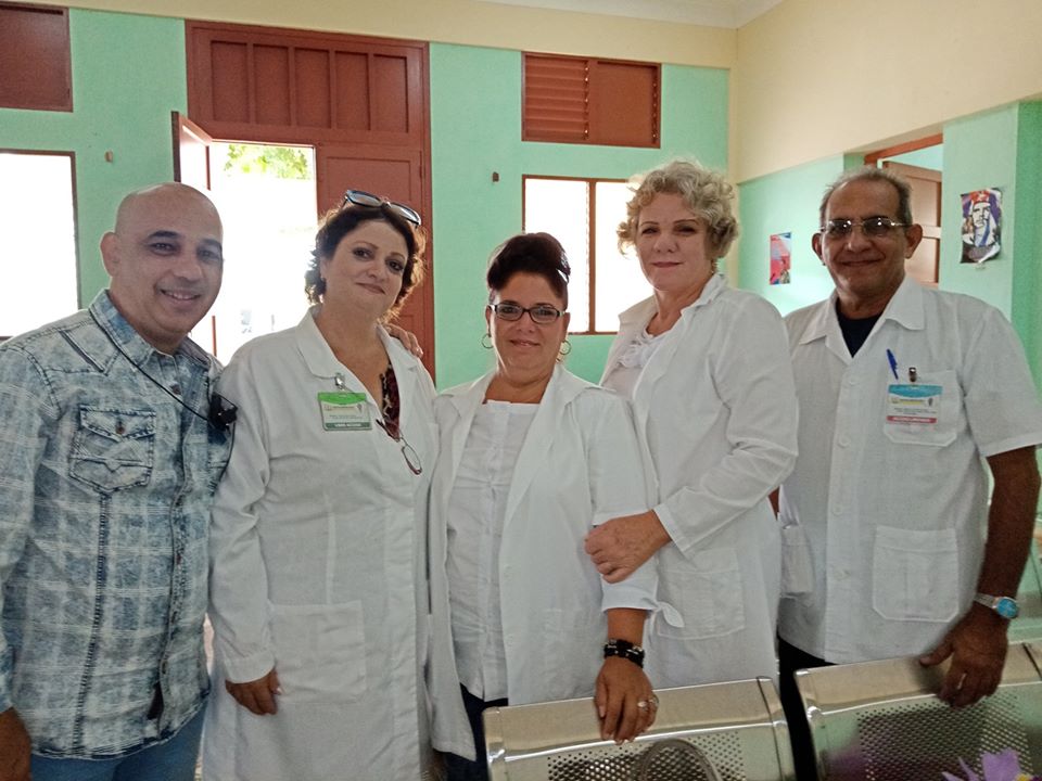 La doctora Mayta Brito (segunda de izquierda a derecha) y el doctor Miguel Ángel Gutiérrez (primero a la derecha)  junto a otros compañeros del hospital (Foto tomada de página en Facebook de la institución)
