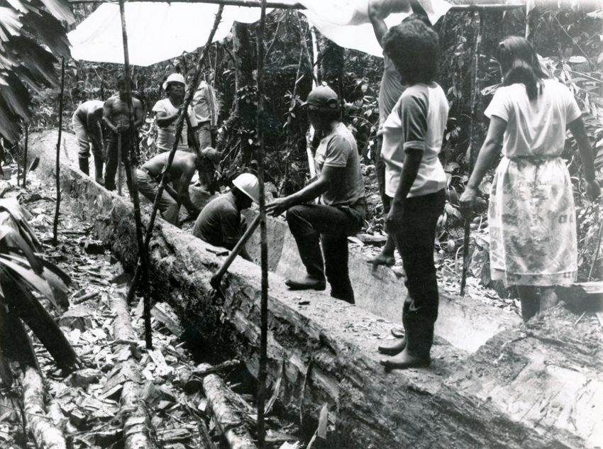 Yumac Ortiz, hija de Lenin y presidenta de la corporación Procultur, nos precisa cómo su padre recibió el apoyo “de la familia Alonso Andi Licuy, que era el líder de la comunidad El Pano en la provincia de Napo, en la parroquia de Puerto Misahuallí, y comienza a trabajar un poco en el proceso de organización”. Para avanzar selva adentro en la búsqueda de los árboles requeridos para la construcción de las canoas, “Andi Licuy arma toda una minga. La minga quiere decir un trabajo compartido, lo que está dentro de la cosmovisión de los quichuas y de nuestros pueblos originarios, así como se han ido desarrollando las comunas para abrir algún canal de riego, o sea, todo se hace en comunidad”.