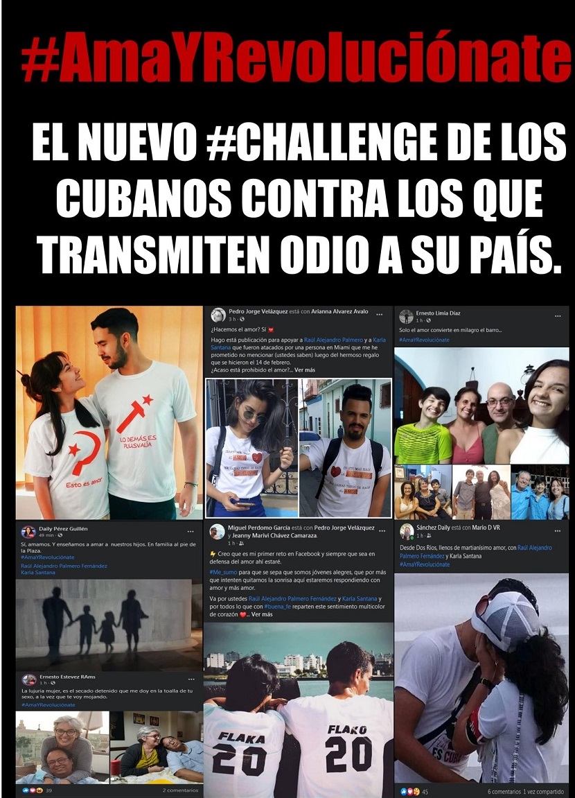 Tanto es así, que creó en Facebook un reto que se ha expandido velozmente por estos espacios virtuales. #AmaYRevoluciónate, como respuesta a un comentario sobre la publicación que hicieran los jóvenes Raúl Alejando Palmero y Karla Santana, por el Día del Amor, en la cual subieron una foto en pareja con pulóveres que llevaban la frase: “Esto es amor, lo demás es plusvalía”.